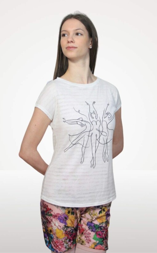 T-Shirt Je danse avec impression numérique Modèle à manches courtes avec encolure bateau. Tissu : Coton 97% – Élasthanne 3% (Fabriqué en Italie) Instructions de lavage Lavage en machine température maximale 30°C. Cycle délicat. Ne pas javelliser.